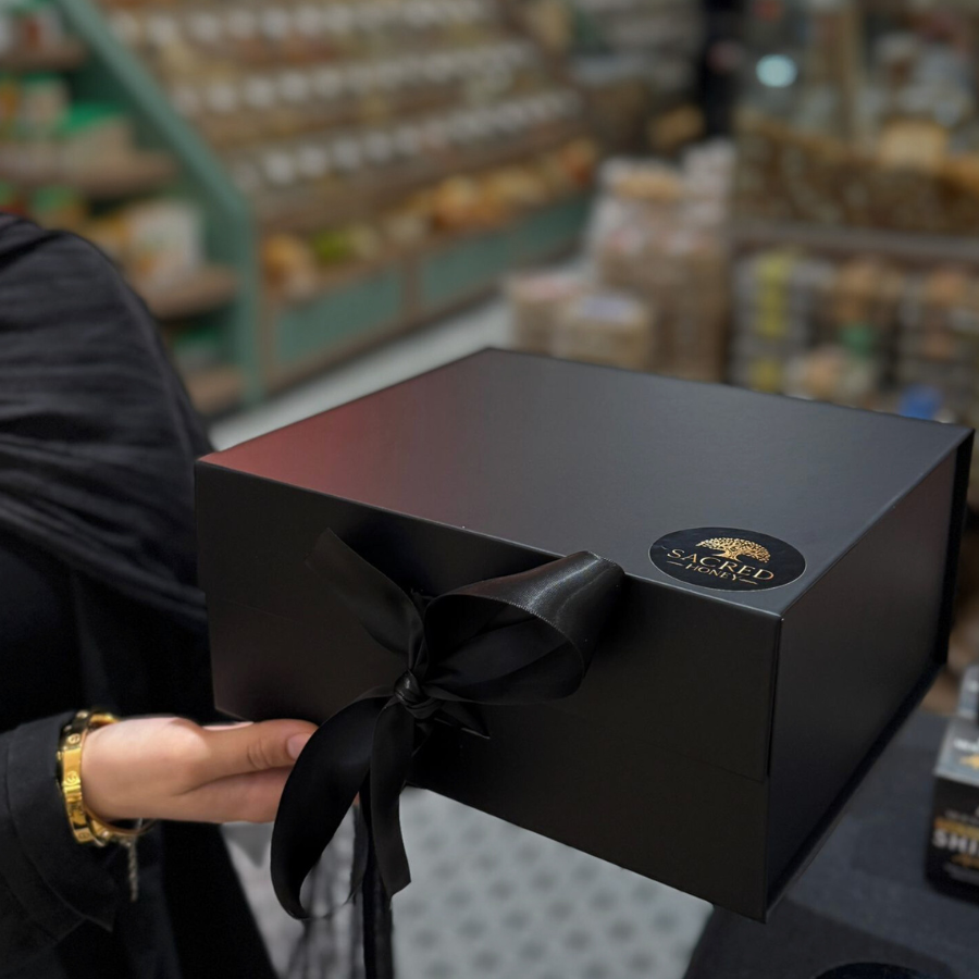 Crafted in a matte-black finish, our gift box is designed to hold and present your honey beautifully.